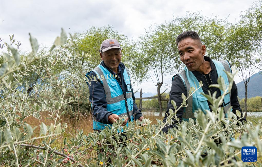 雅尼國家濕地公園管護(hù)員普布多杰(右)和同事在巡護(hù)途中查看樹木長勢(9月8日攝)。新華社發(fā)(丁增尼達(dá) 攝)