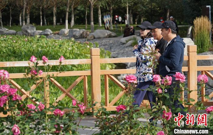 圖為兩位烏茲別克斯坦政黨代表(右一、中)參訪西寧市北山美麗園。馬銘言 攝