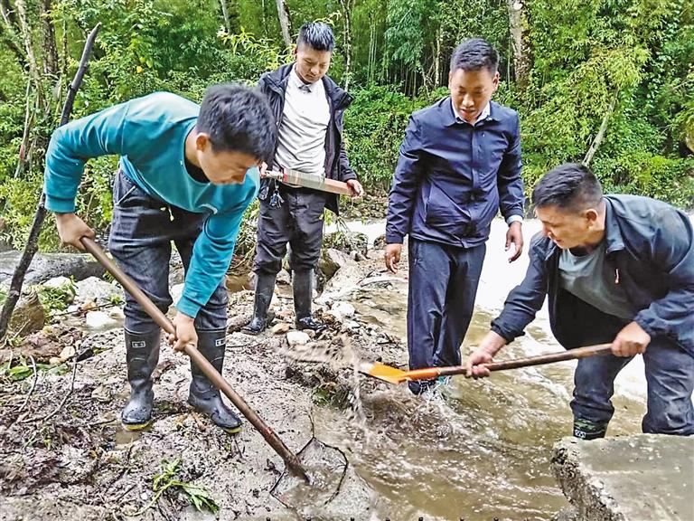 林芝市墨脫縣格當鄉(xiāng)多龍崗村黨員干部與群眾共同清理河道。
