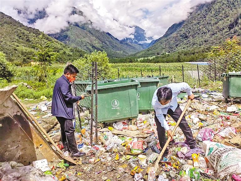 林芝市墨脫縣格當鄉(xiāng)布龍村組織人員清理垃圾堆放點。記者 王敏 通訊員 郎玲 攝
