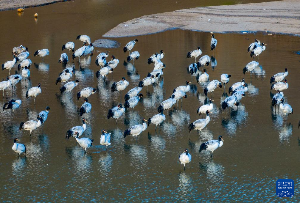 這是在拉薩市林周縣虎頭山水庫拍攝的越冬黑頸鶴(10月24日攝,無人機(jī)照片)。新華社記者 姜帆 攝