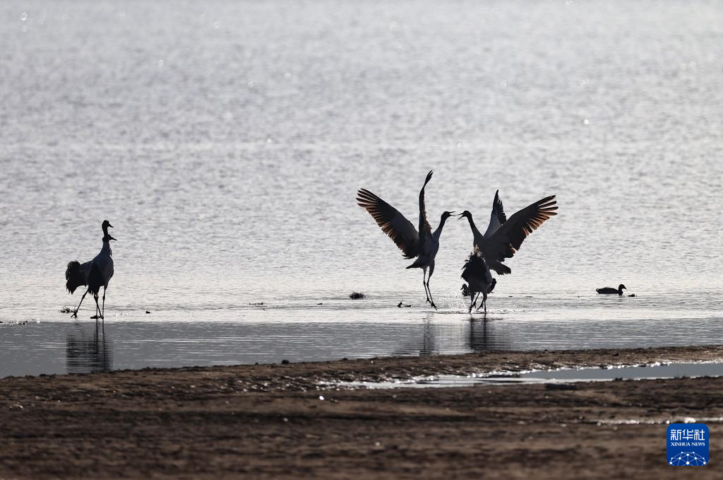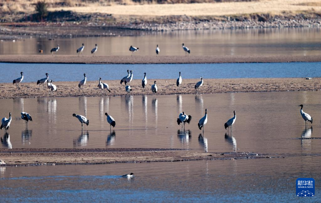 這是在拉薩市林周縣虎頭山水庫拍攝的越冬黑頸鶴(10月24日攝)。新華社記者 姜帆 攝