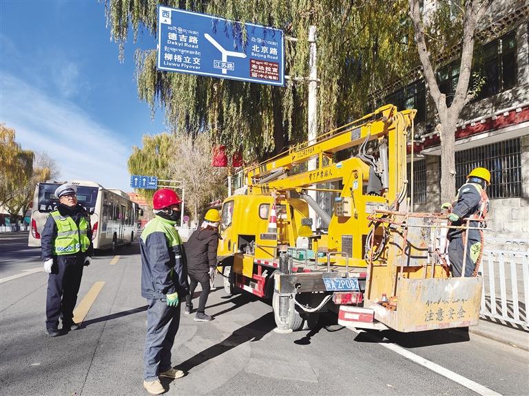 園林工人修剪遮擋路燈、監(jiān)控探頭的枝葉。圖由拉薩城關(guān)區(qū)潔達園林綠化投資工程有限公司提供