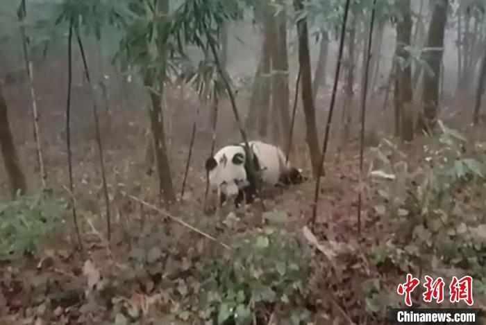 四川寶興:村民偶遇野生大熊貓?jiān)诹种谢顒?dòng)