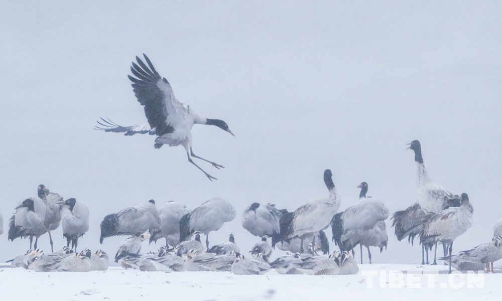 資料圖:在虎頭山水庫越冬的黑頸鶴