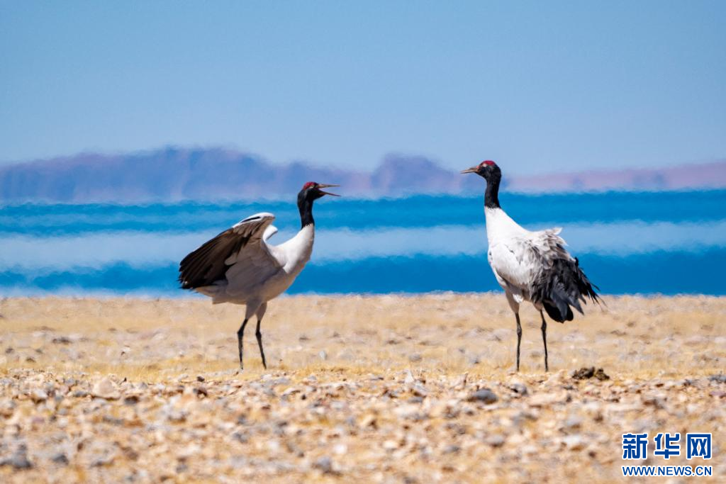 4月14日,在色林錯(cuò)國家級自然保護(hù)區(qū)拍攝的黑頸鶴。新華網(wǎng) 旦增努布 攝