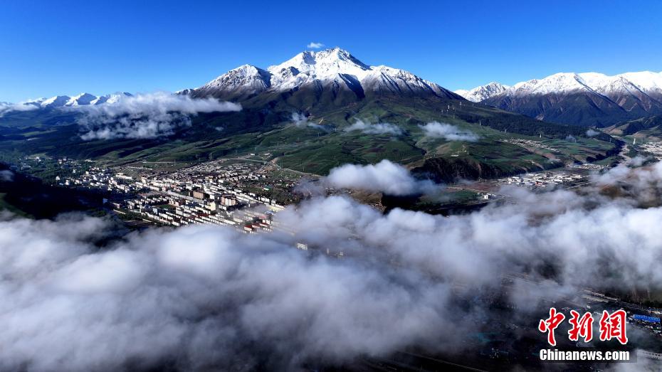 6月,攝影愛好者拍攝到的祁連山腹地青海省海北藏族自治州祁連縣云霧繚繞,云海與雪山、峽谷、森林交相輝映,蔚為壯觀。畫面中,云層飄浮在群山之間,時而薄如輕紗,時而團若棉絮,形成了美麗的低空云海,山間小城在薄云繚繞下,若隱若現(xiàn),宛若仙境。圖為祁連縣城區(qū)云霧繚繞。