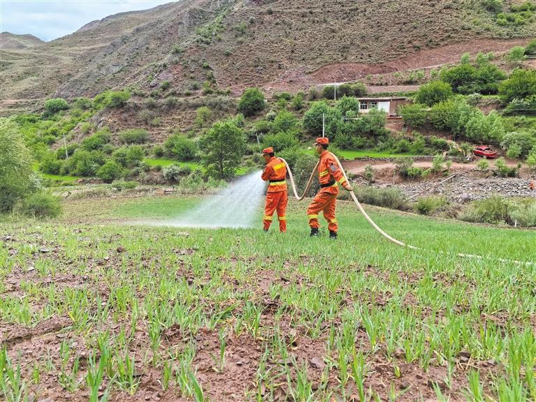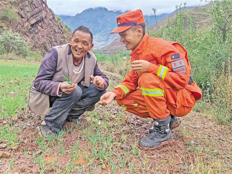 圖為消防員與俄洛鎮(zhèn)村民查看田地灌溉情況。