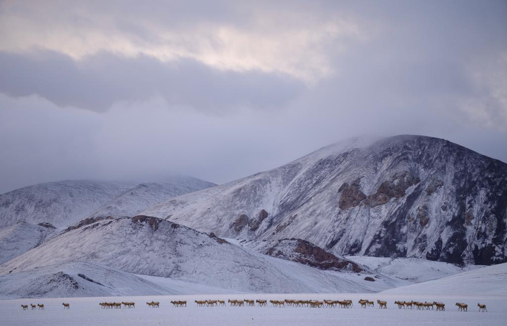 6月15日清晨雪后,在羌塘國家級自然保護區(qū),迎著朝霞前行在遷徙路上的一群藏羚羊。