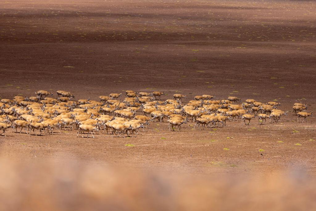 大群藏羚羊在羌塘保護區(qū)核心區(qū)向產(chǎn)羔地遷徙(5月9日攝)。
