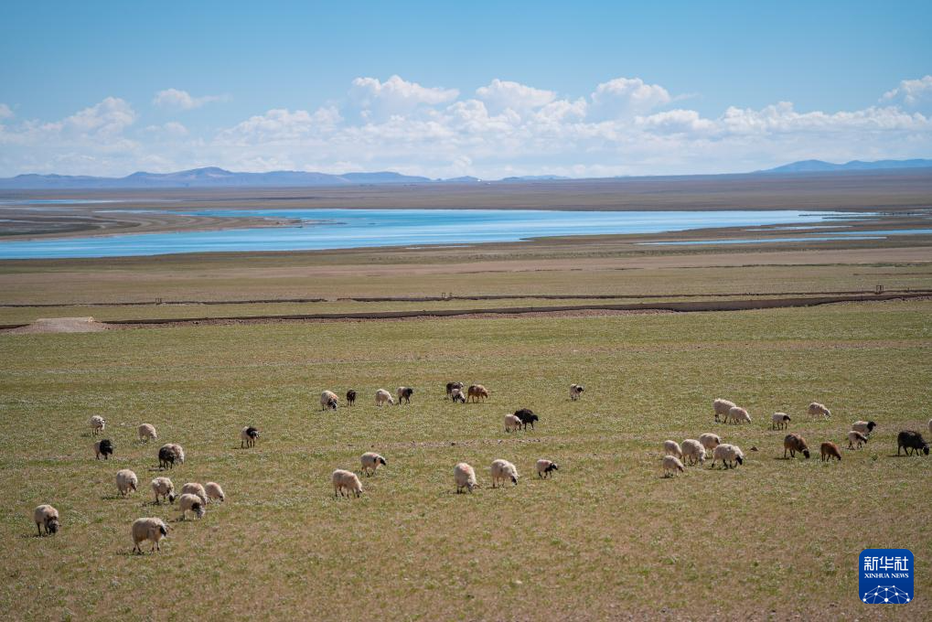 6月22日,羊群在色林錯(cuò)湖畔草場(chǎng)上吃草。新華社記者 丁增尼達(dá) 攝
