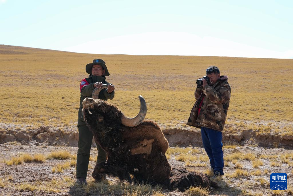 6月13日,羌塘國家級自然保護(hù)區(qū)野生動物專業(yè)管護(hù)隊員在檢查一頭野牦牛的尸體。新華社記者 旦增尼瑪曲珠 攝