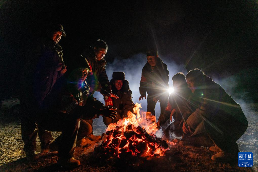 5月10日,野生動物專業(yè)管護(hù)隊員在宿營地用野牦牛糞烤火取暖。新華社記者 丁增尼達(dá) 攝