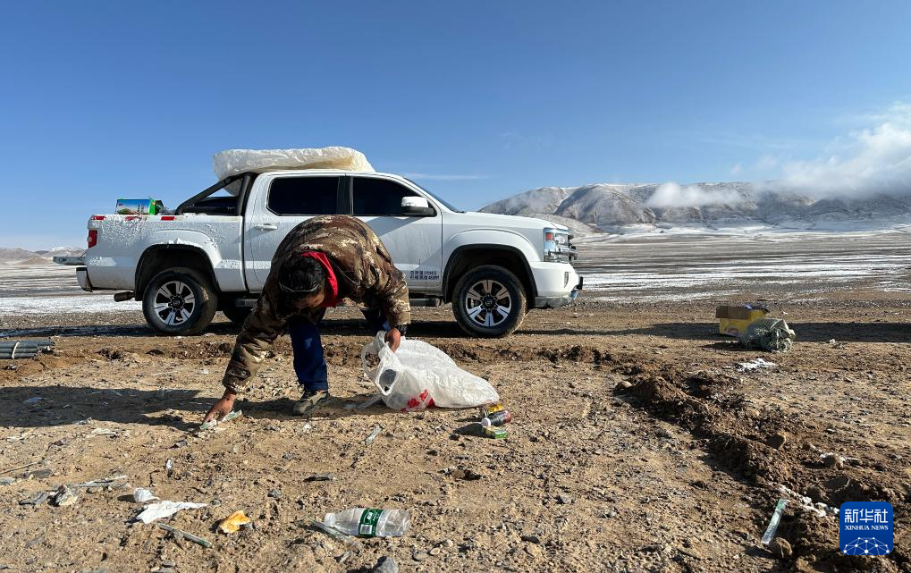 6月15日,格桑倫珠在撿拾宿營地的垃圾,準(zhǔn)備裝車帶走。新華社記者 費(fèi)茂華 攝