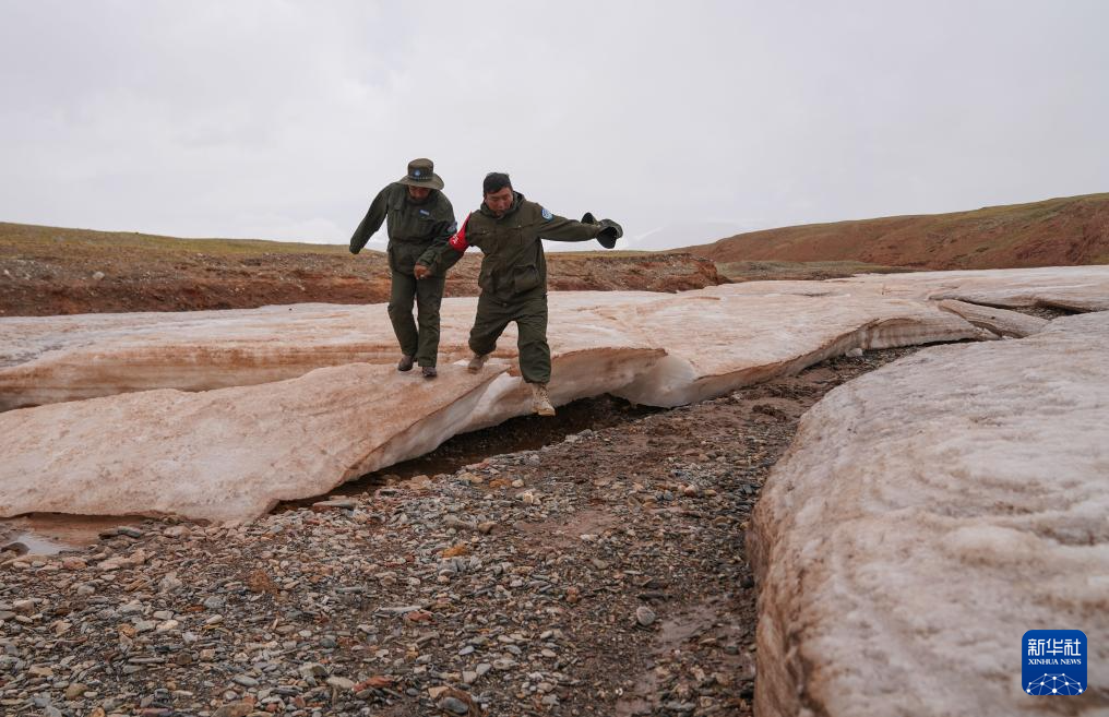 6月15日,羌塘國家級自然保護(hù)區(qū)野生動物專業(yè)管護(hù)隊員索朗(右)和羅布檢查河面冰凍情況。新華社記者 費(fèi)茂華 攝