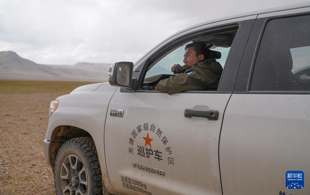 6月15日,羌塘國家級自然保護(hù)區(qū)野生動物專業(yè)管護(hù)隊員羅布通過對講機(jī)聯(lián)系巡邏路上的隊員。新華社記者 晉美多吉 攝