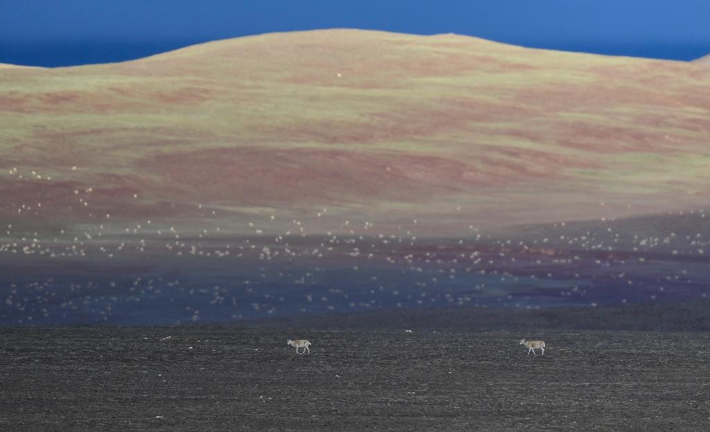 這是2020年7月7日在可可西里卓乃湖區(qū)域拍攝的兩只藏羚羊,后面的山坡上有大群覓食的藏羚羊。新華社記者 張龍 攝