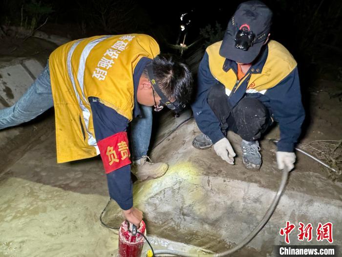 如墨的夜色下,經(jīng)過2個(gè)小時(shí)的連續(xù)抽水,排水溝的大部分積水被抽出,職工們頭戴照明燈,手握鐵鍬一字?jǐn)[開,開始深一腳淺一腳,清理溝底淤泥,道道搖曳不定的光柱,在靜默的夜空下閃爍交織。