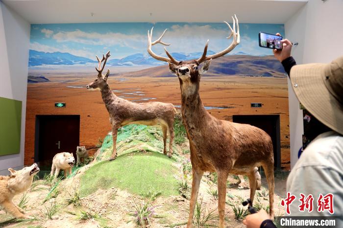 7月24日,參加“中國式現(xiàn)代化的萬千氣象·網(wǎng)絡(luò)名人青海行”活動的網(wǎng)絡(luò)名人,抵達江河源頭青海玉樹藏族自治州,在玉樹州博物館一覽自然與人文之美。玉樹州博物館是玉樹地震災(zāi)后重建十大標(biāo)志性建筑之一,分為序廳、自然展區(qū)、人文展區(qū)、臨時展廳。其通過實物標(biāo)本等方式,展示了三江源和可可西里的野生動物、草地、森林,以及玉樹州的歷史、建筑、服飾、飲食等。圖為玉樹州博物館內(nèi)的野生動物展示。中新社記者 張?zhí)砀?攝