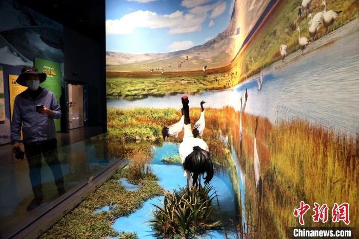 7月24日,參加“中國式現(xiàn)代化的萬千氣象·網(wǎng)絡(luò)名人青海行”活動的網(wǎng)絡(luò)名人,抵達江河源頭青海玉樹藏族自治州,在玉樹州博物館一覽自然與人文之美。玉樹州博物館是玉樹地震災(zāi)后重建十大標(biāo)志性建筑之一,分為序廳、自然展區(qū)、人文展區(qū)、臨時展廳。其通過實物標(biāo)本等方式,展示了三江源和可可西里的野生動物、草地、森林,以及玉樹州的歷史、建筑、服飾、飲食等。圖為玉樹州博物館展示的黑頸鶴棲息環(huán)境。中新社記者 張?zhí)砀?攝