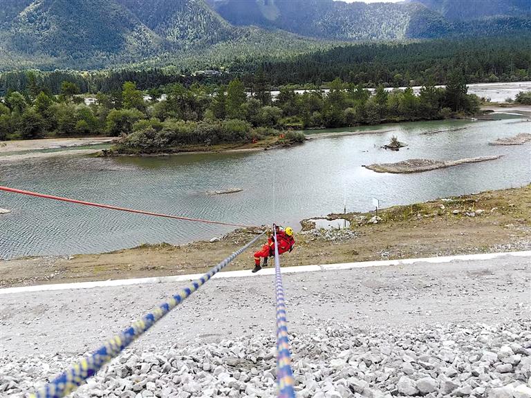 圖為波密縣森林消防中隊隊員開展橫渡孤島轉(zhuǎn)移救援演練。記者 張宇 攝