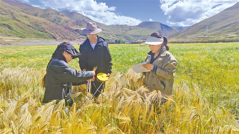 圖為比如縣相關(guān)工作人員在田間開展青稞測產(chǎn)分析工作。記者 萬靖 攝