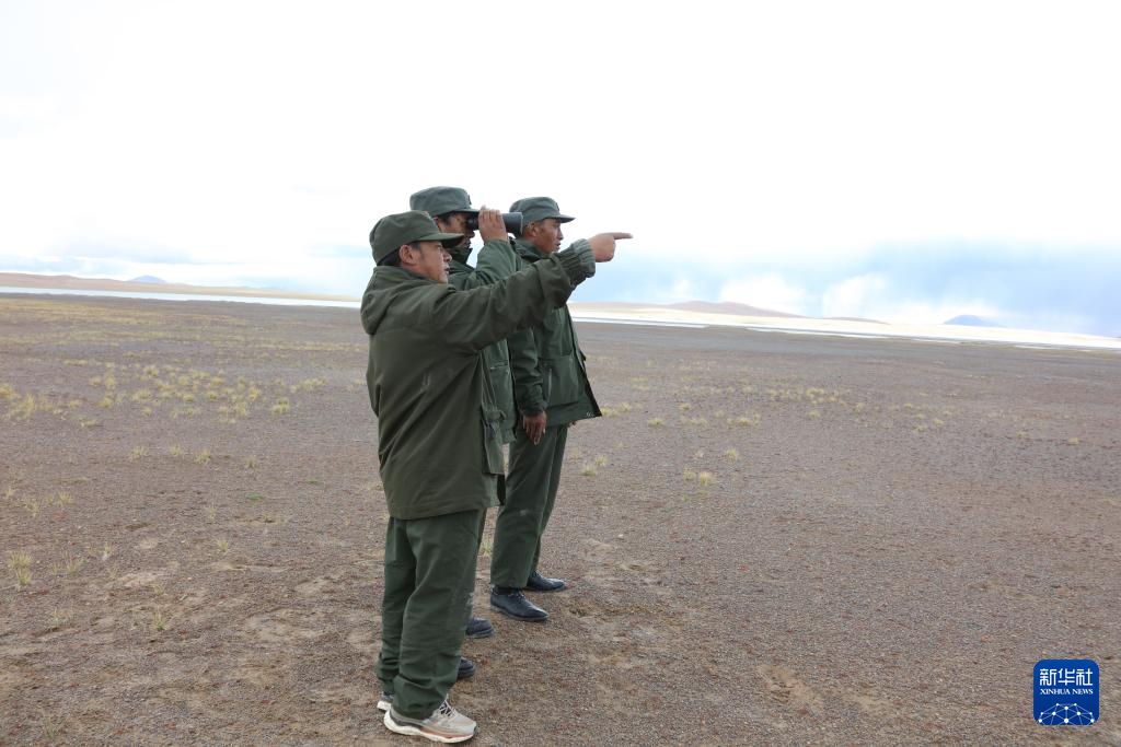 野生動物專業(yè)管護(hù)隊員在令戈錯旁巡護(hù)(9月8日攝)。新華社記者 劉詩平 攝