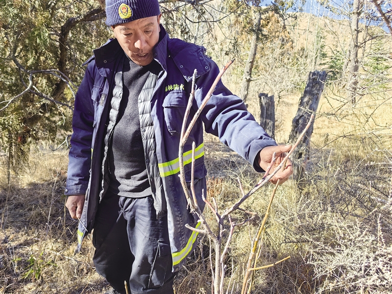 目前,南山公園的樹種特別多,有油松、竹子、桃樹、楊樹、杏樹等。“秋天到來(lái)后,樹上有野山桃、山杏等果實(shí),我有時(shí)會(huì)摘一些成熟的水果吃。”扎西曲培說(shuō),“南山公園就像自己的孩子,看著它一點(diǎn)點(diǎn)長(zhǎng)大。時(shí)間越久,我對(duì)南山公園的感情越深?!?/p>