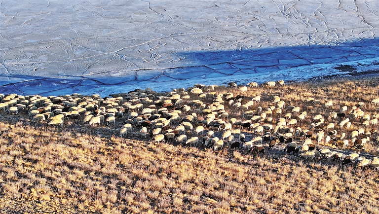 朝陽下,羊群在牧民和民警的保護(hù)下前往湖心島牧場。(圖片均由記者 旦增蘭澤 平措次仁 晉巴次成 武沛濤 攝)