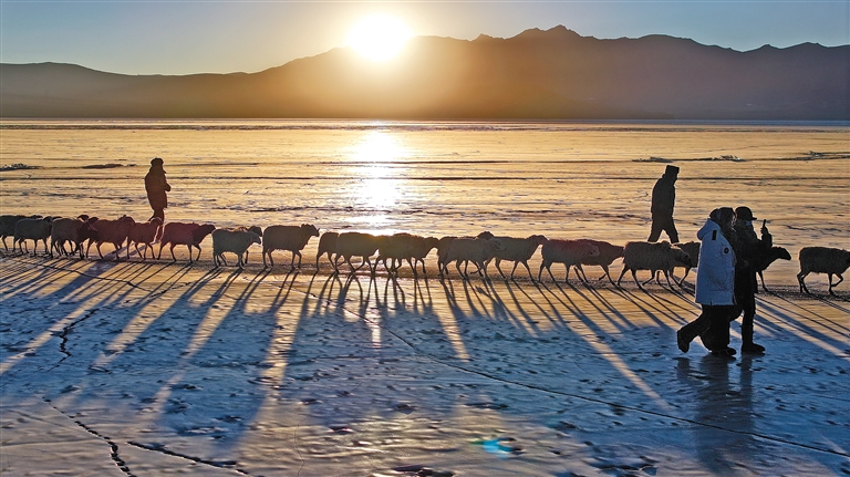 當(dāng)?shù)夭刈迥撩裼惺来鄠鞯内s羊傳統(tǒng),這是為了讓羊群在冬季也能吃到新鮮的牧草。他們將羊群從岸邊趕向湖心島,那里有未被冰雪覆蓋的草地,既保障了羊群的飼料需求,又避免了過度放牧對草場的破壞。