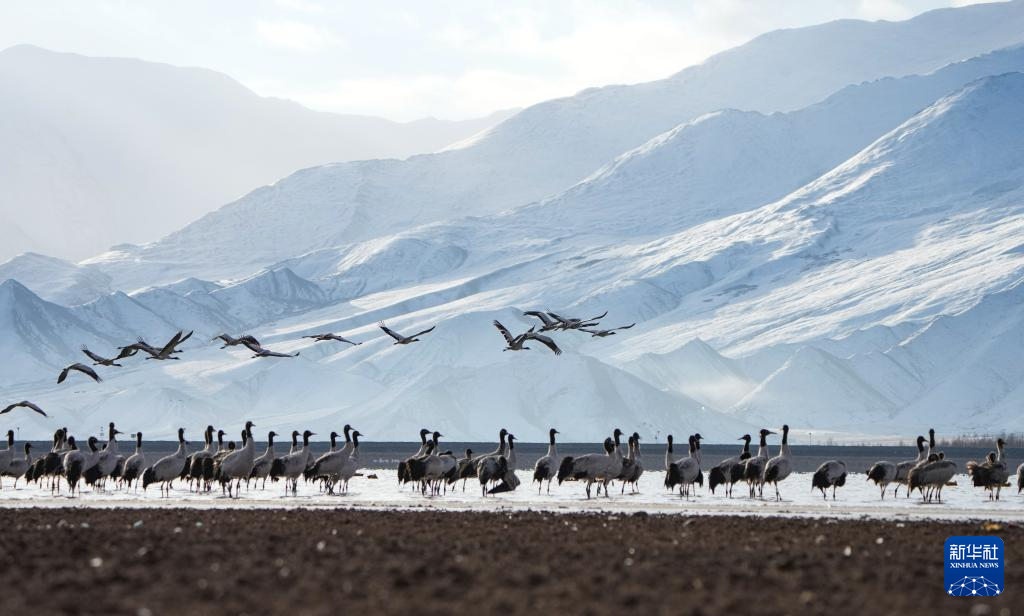 西藏自治區(qū)拉薩市林周縣平均海拔約4200米,是黑頸鶴的主要越冬地之一。一場冬雪,將林周縣虎頭山水庫染成一片銀白,黑頸鶴仿佛是這潔白舞臺優(yōu)雅的舞者。