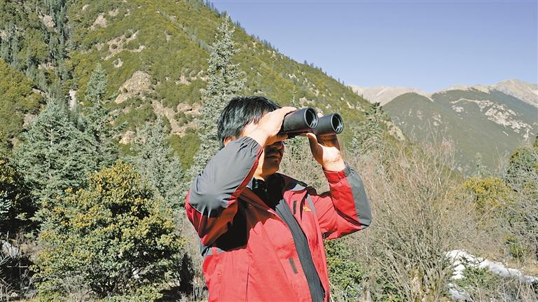 貢覺縣則巴鄉(xiāng)夏日村的護(hù)林員用望遠(yuǎn)鏡眺望巡查林區(qū)。記者 貢秋曲措 通訊員 董燕 西繞丹青 攝