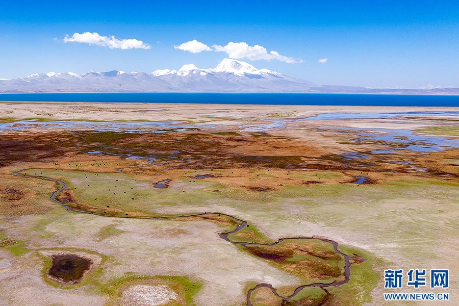遠(yuǎn)處的瑪旁雍錯與綠意漸濃的濕地(6月9日攝,無人機(jī)照片)。新華網(wǎng) 旦增努布 攝