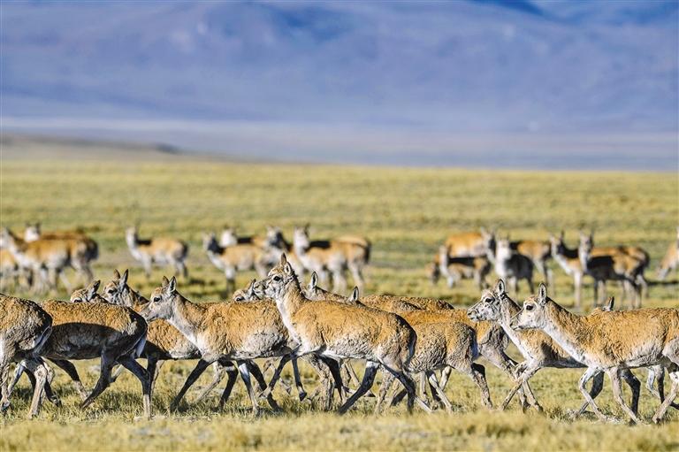 每年5月至7月,藏北高原羌塘國家級自然保護(hù)區(qū)內(nèi)的雌性藏羚羊進(jìn)入遷徙繁殖季。它們從平時散居的棲息地匯集一處,形成成千上萬頭的種群,遵循同樣的時間和路線,向著族群自古以來的產(chǎn)羔地遷徙,這是被譽為“全球最壯觀的三大有蹄類動物大遷徙之一”的藏羚羊遷徙。