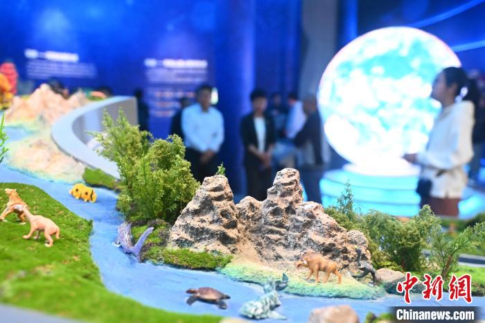 6月16日,在位于甘肅省張掖市肅南裕固族自治縣的祁連山國(guó)家公園自然博物館內(nèi),游人參觀祁連山動(dòng)植物演化沙盤(pán)模型。中新社記者 李亞龍 攝