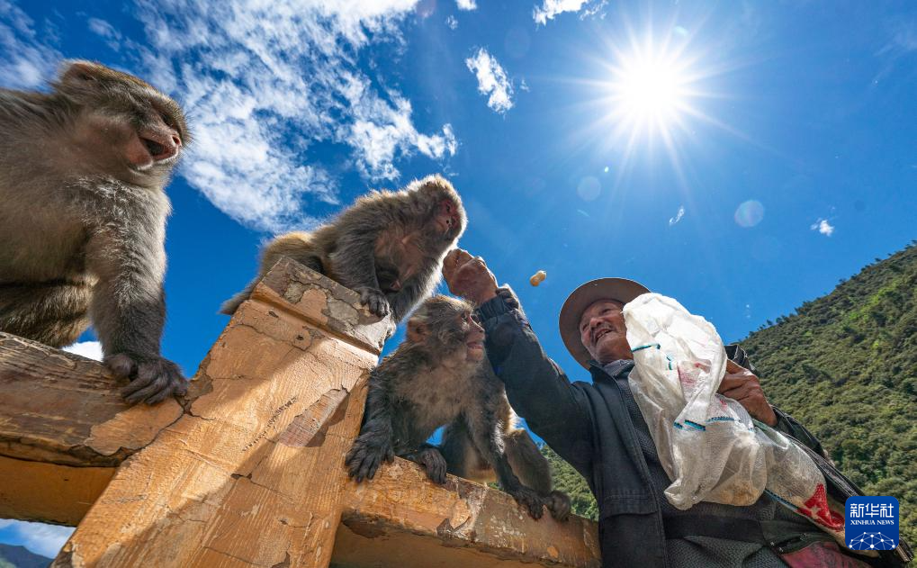在林則生態(tài)文化旅游景區(qū),多布杰老人在給藏獼猴喂花生(7月23日攝)。新華社記者 丁增尼達 攝