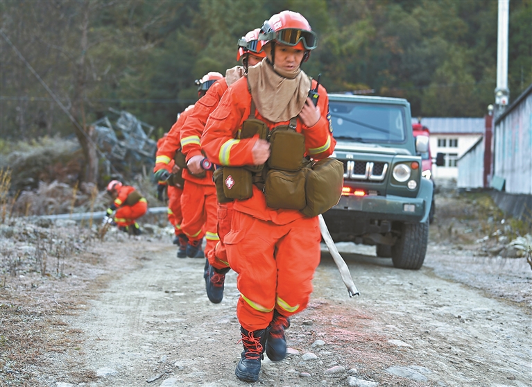 波密縣森林消防中隊(duì)駐墨脫分隊(duì)集結(jié)前往演練現(xiàn)場(chǎng)。記者 王敏 通訊員 郎玲 攝