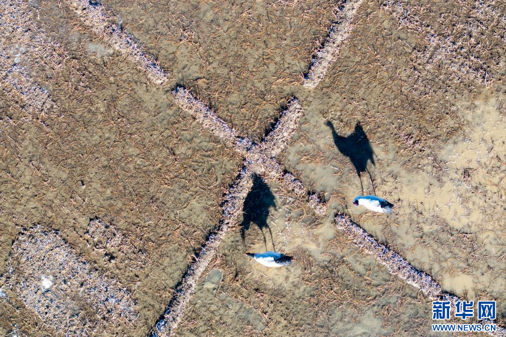 12月19日,在西藏日喀則市南木林縣的雅魯藏布江河畔田間覓食的黑頸鶴(無人機(jī)照片)。新華網(wǎng) 旦增努布 攝