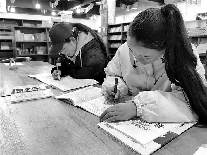 圖為西藏拉薩市第四高級中學的高三生強巴曲珍和白瑪在寒假期間來到圖書館做測試題,備戰(zhàn)今年6月的高考。記者 索朗瓊珠 攝