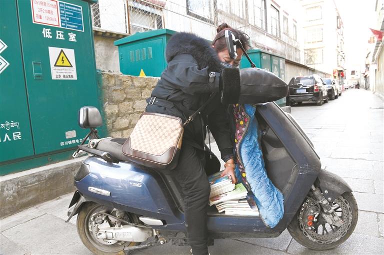 圖為城關(guān)區(qū)第二小學(xué)三年級(jí)(11)班班主任旦增色珍騎著電動(dòng)車(chē)把分類分揀好的教材送到學(xué)生家中。