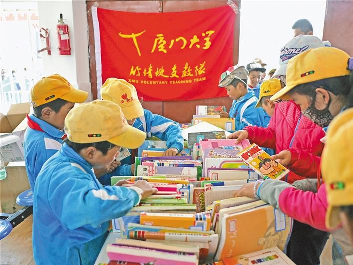 圖為廈門大學(xué)竹蜻蜓支教隊(duì)在當(dāng)雄縣龍仁鄉(xiāng)中心小學(xué)舉辦流動(dòng)圖書(shū)館活動(dòng)。通訊員 黃宇霞 高捷 何春雨 崔慶煒
