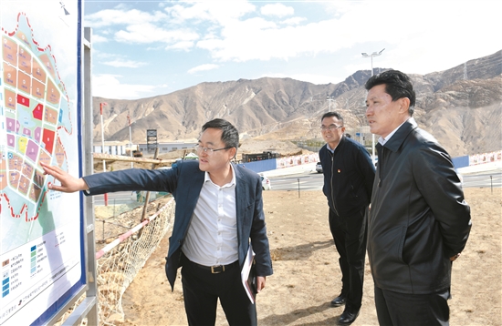 4月16日上午,市委副書記、市長、城關區(qū)委書記果果調研拉薩高新區(qū)部分在建項目進展情況。圖為果果在施工現場查看工程效果圖、聽取拉薩高新區(qū)負責人的匯報。拉薩融媒記者 巴桑次仁攝