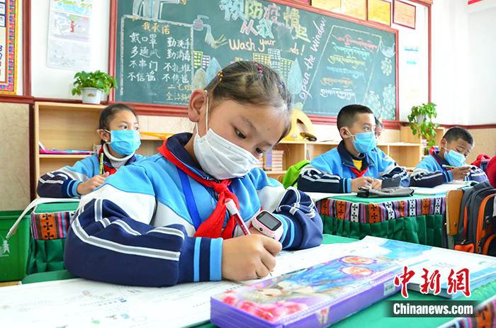 4月15日,玉樹市第三完全小學的學生在課堂上做筆記。中新社記者 魯?shù)り?攝