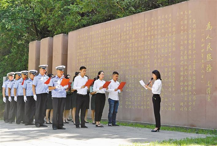 6月29日,在延安市張思德廣場(chǎng),黨員干部在誦讀《為人民服務(wù)》。新華社記者 張博文 攝