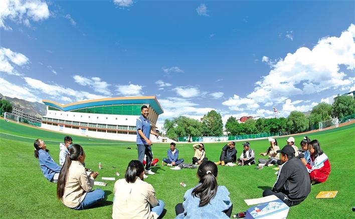 圖為拉薩中學(xué)高三(4)班班主任次旦朗加組織學(xué)生們參加課外活動(dòng),幫助大家釋放壓力,調(diào)整心態(tài),為考生們加油助威。記者 潘多 攝