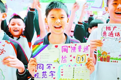 9月17日,河南靈寶市解放小學(xué)學(xué)生用手抄報形式宣傳推廣普通話。劉曉偉攝/光明圖片