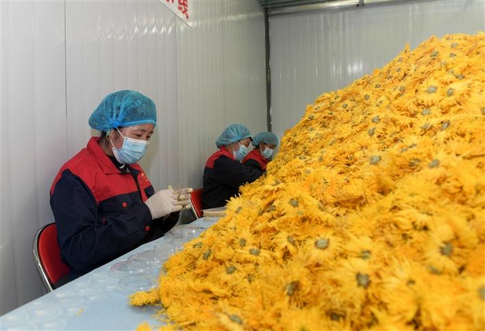 圖為經(jīng)過培訓(xùn)的崗巴縣崗巴鎮(zhèn)群眾在金絲皇貢菊種植基地內(nèi)工作。潘多 唐斌 攝