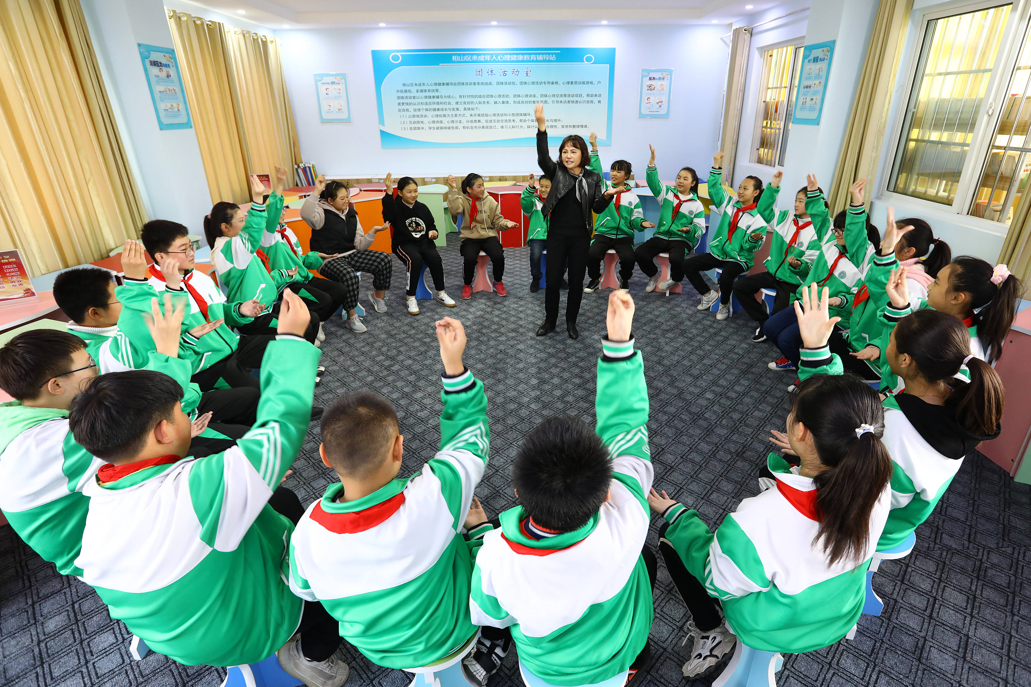 11月15日,安徽省淮北市翠峰小學學生在相山區(qū)未成年人心理健康輔導站團體輔導室做游戲。