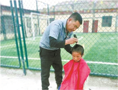 才旦多吉每兩周給學生洗一次澡,每個月給他們理一次發(fā)。他自己買了理發(fā)工具,研究怎樣剪出孩子們喜歡的發(fā)型,一開始理出的頭發(fā)總是不整齊,想給學生做個洋氣的發(fā)型,也總是做得奇形怪狀。后來理發(fā)的次數(shù)多了,水平就提升了。才旦多吉笑稱自己是“鄉(xiāng)村版的托尼老師”。