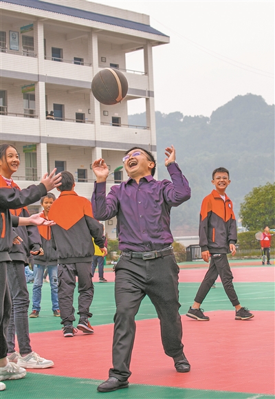 課余時(shí)間,李友生與孩子們打籃球玩鬧,開(kāi)心得像個(gè)孩子。劉磊 攝